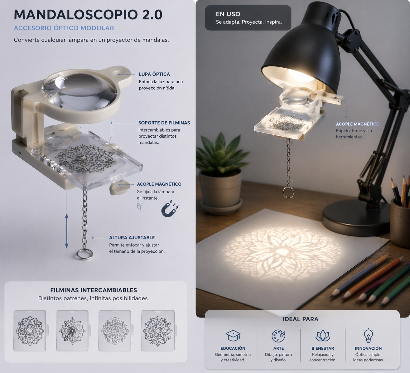 Prototipo 2.0: En esta nueva versión se ha reducido el mandaloscopio a un accesorio capaz de colocarse en cualquiér lámpara de escritorio.