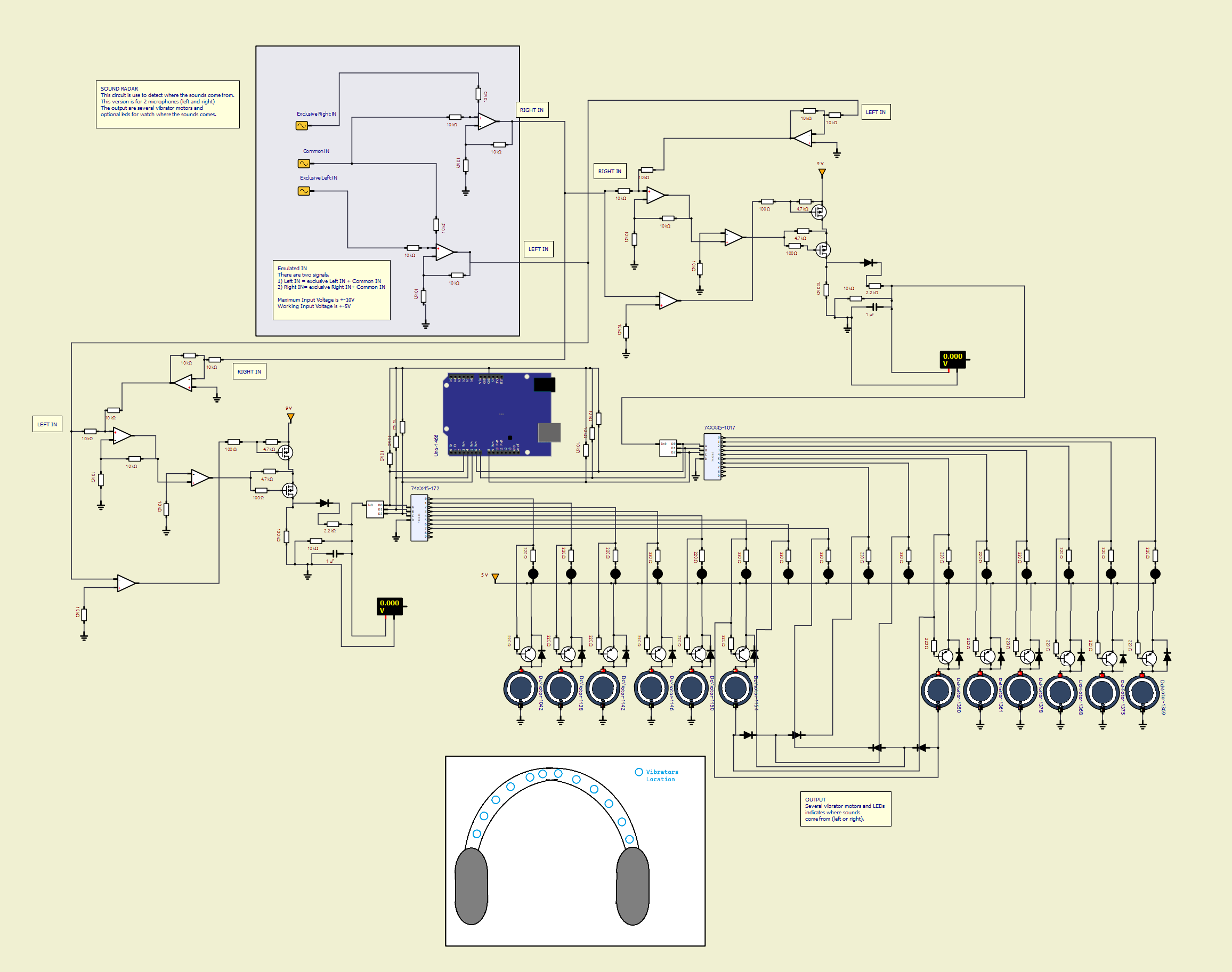 El circuito permite mediante vibradores avisar desde donde viene el sonido eliminando el ruido común entre la señal izquierda y derecha de un auricular.